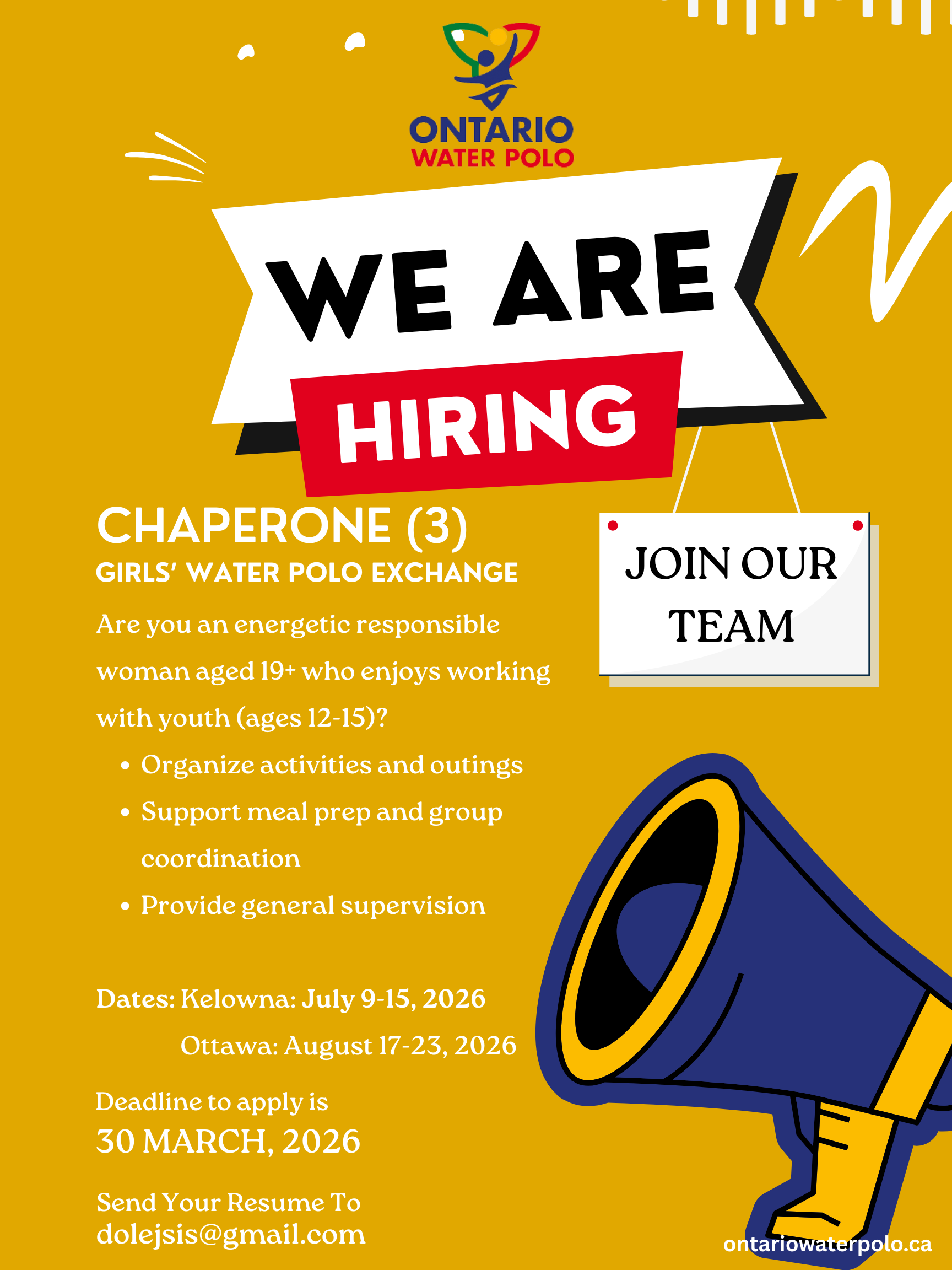 Ontario Water Polo is currently looking for three chaperones to support our upcoming Girls Water Polo Exchange with Water Polo West this summer.